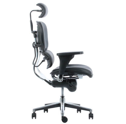 Silla con mecanismo sincrónico con desplazador de asiento, posición de trabajo activo a 85º además de múltiples posiciones de reclinación y sistema de tensión regulable. Apoya cabeza de cuero regulable en altura y ángulo. Respaldo de malla regulable en altura y soporte lumbar con ajuste de tensión tapizado en cuero italiano. Apoyabrazos de PU regulables en altura, ángulo, profundidad e inclinación. Asiento tapizado en cuero italiano con diferentes tensiones, gas de 100 mm, base de aluminio 680 mm y ruedas de PU negras de 65 mm.